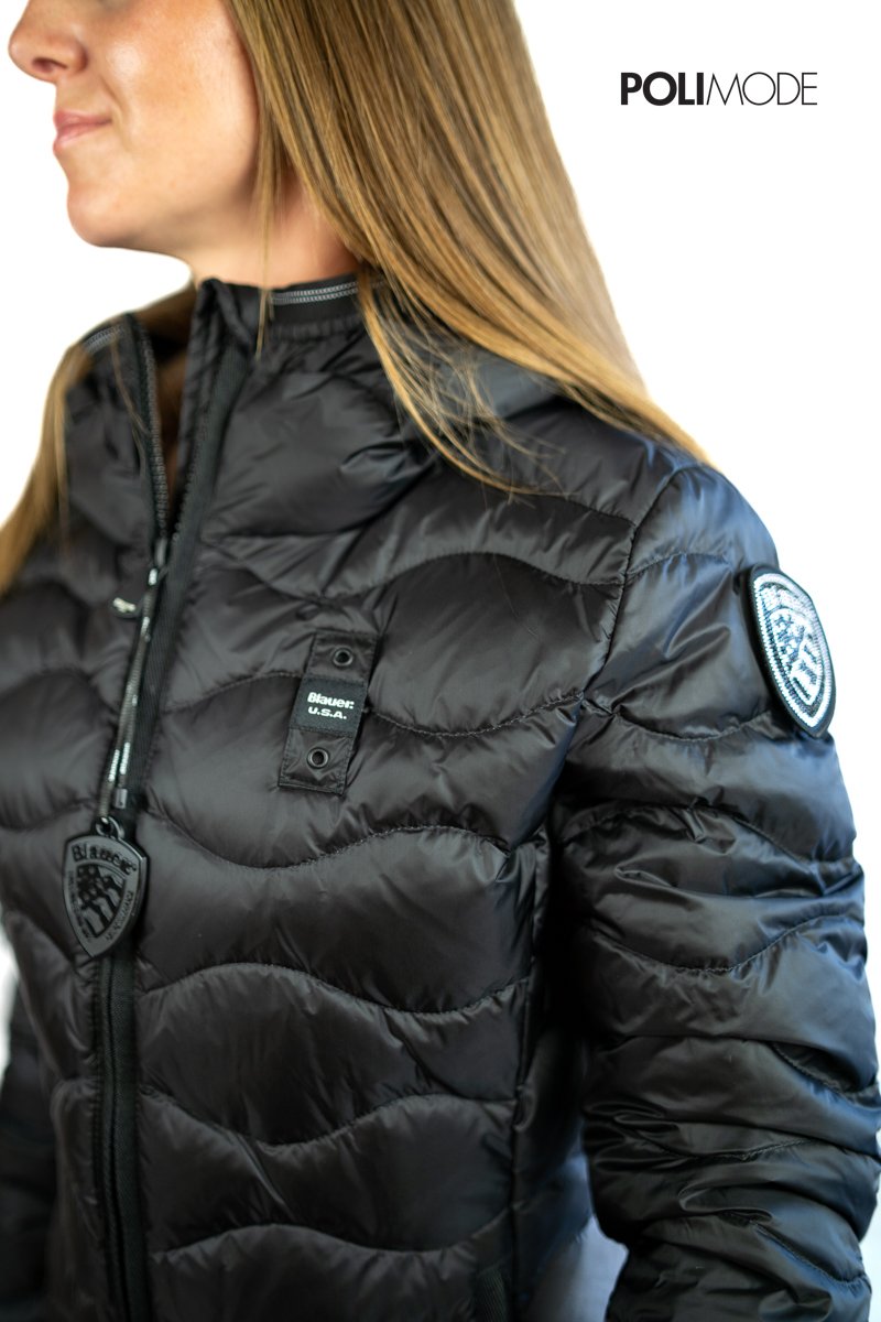 Piumino Blauer idrorepellente trapuntato a onde orizzontali con taglio svasato, pensato per unire comfort, stile e praticità. Realizzato in nylon lucido con fodera interna a contrasto, è imbottito con piuma naturale 90/10 da 150 g, calda ma leggera, che non risulta ingombrante. Il cappuccio fisso con elastico rigato e i dettagli funzionali come la chiusura con zip nascosta e le tasche pratiche rendono questo capo un’icona del brand. Patch glitterata e passante logato completano il design distintivo.