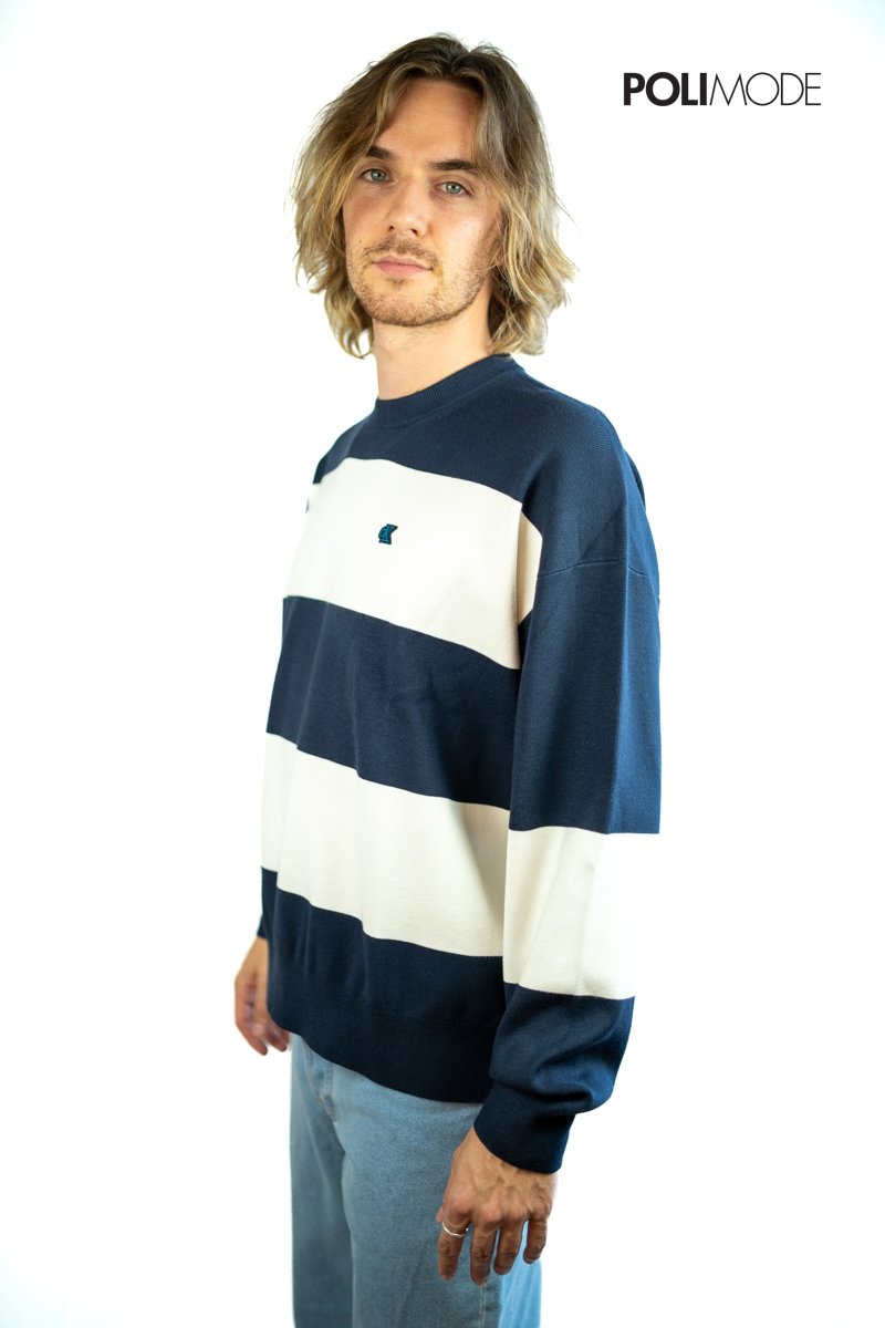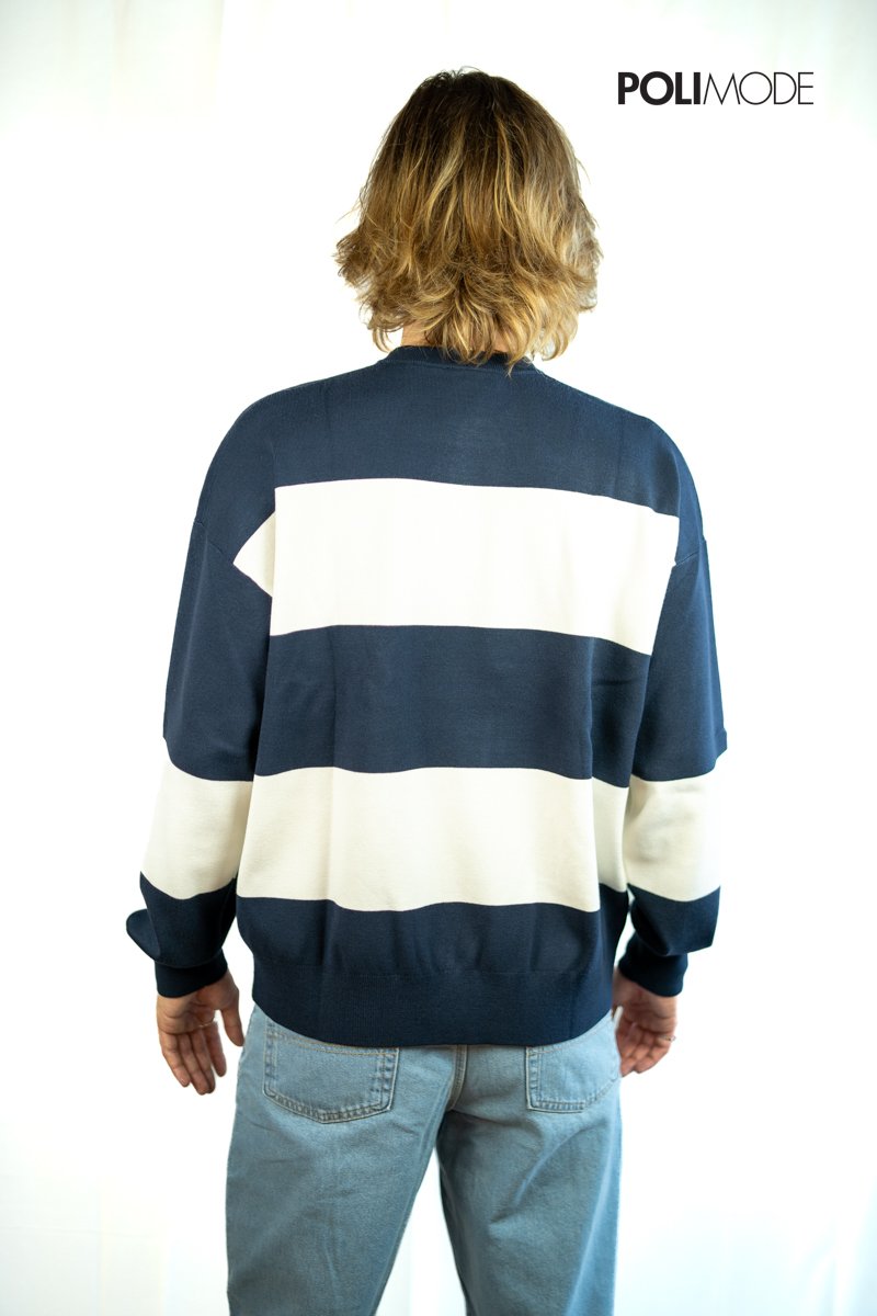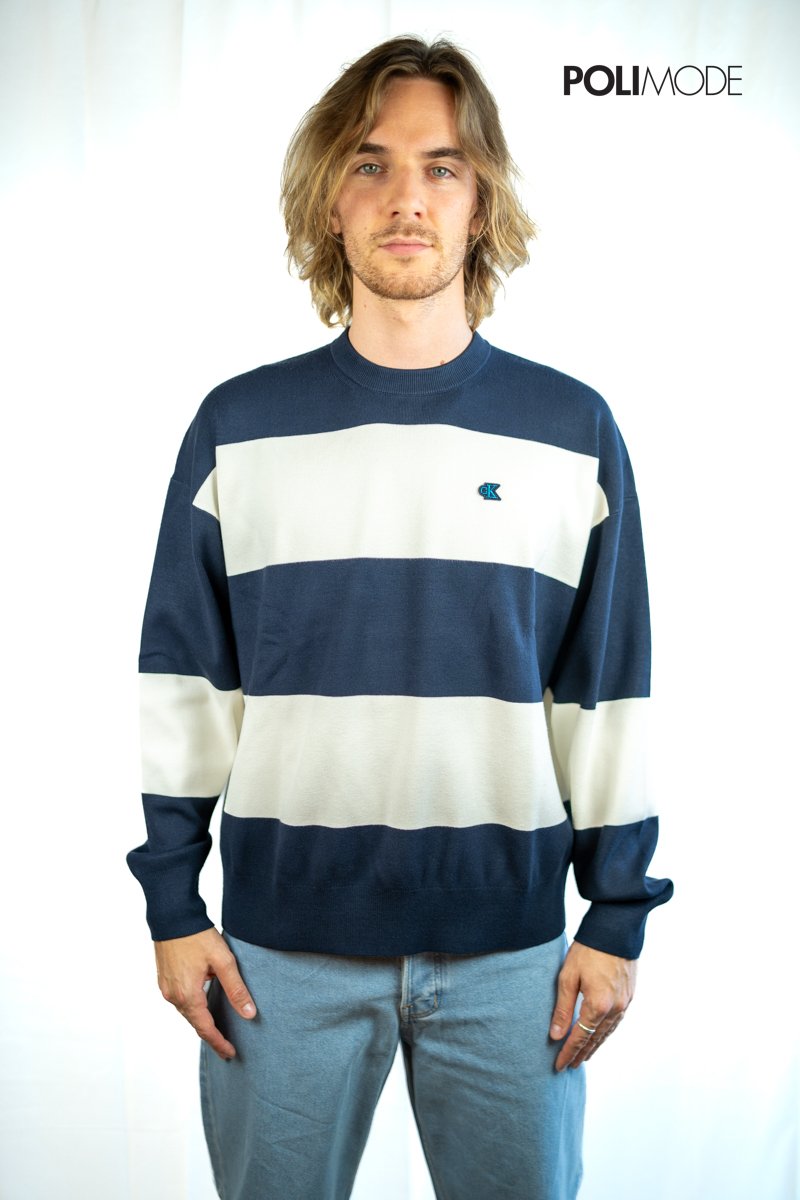 Maglione a righe Calvin Klein da uomo, realizzato in maglia leggera e confortevole. La vestibilità loose fit dona un look casual e rilassato, perfetto per l’uso quotidiano. Il design presenta maniche lunghe, scollatura rotonda e un motivo a righe dal fascino senza tempo. Il monogramma ricamato sul petto aggiunge un dettaglio distintivo e iconico del brand.