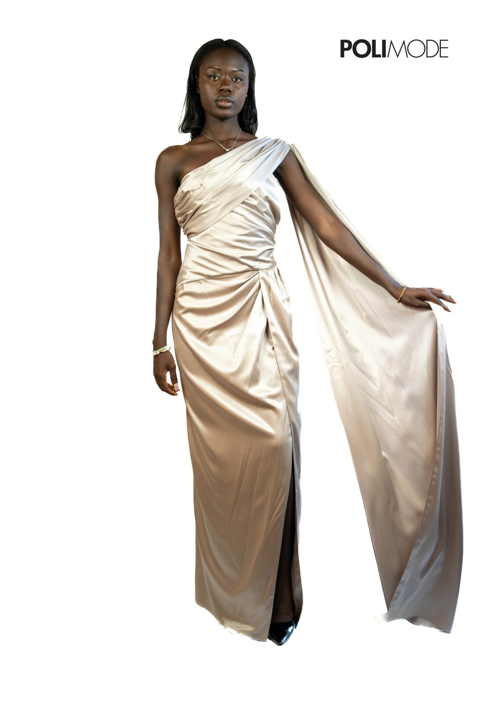 Abito Marciano Guess lungo in tessuto satinato a tinta unita, ideale per le occasioni speciali. Il modello monospalla con pieghe effetto drappeggiato valorizza la silhouette in modo elegante e raffinato. Il bordo superiore rivestito in silicone garantisce una perfetta aderenza, mentre la chiusura laterale con zip e gancio assicura comfort e praticità.