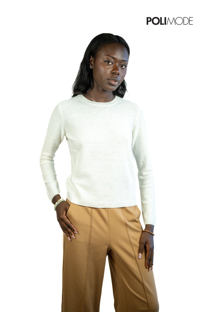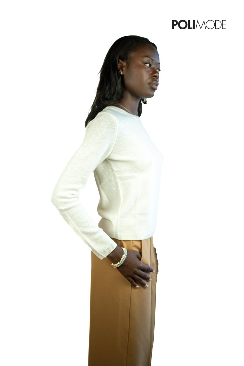 Très chic, la maglia CICLONE in lana sottile unisce eleganza e luce discreta. Lavorata al rovescio per esaltare la texture del tricot, è arricchita da un filo laminato con micro paillettes che donano un tocco brillante ad ogni look. Perfetta per completare outfit raffinati sia di giorno che di sera.